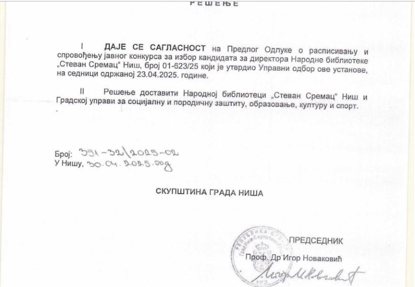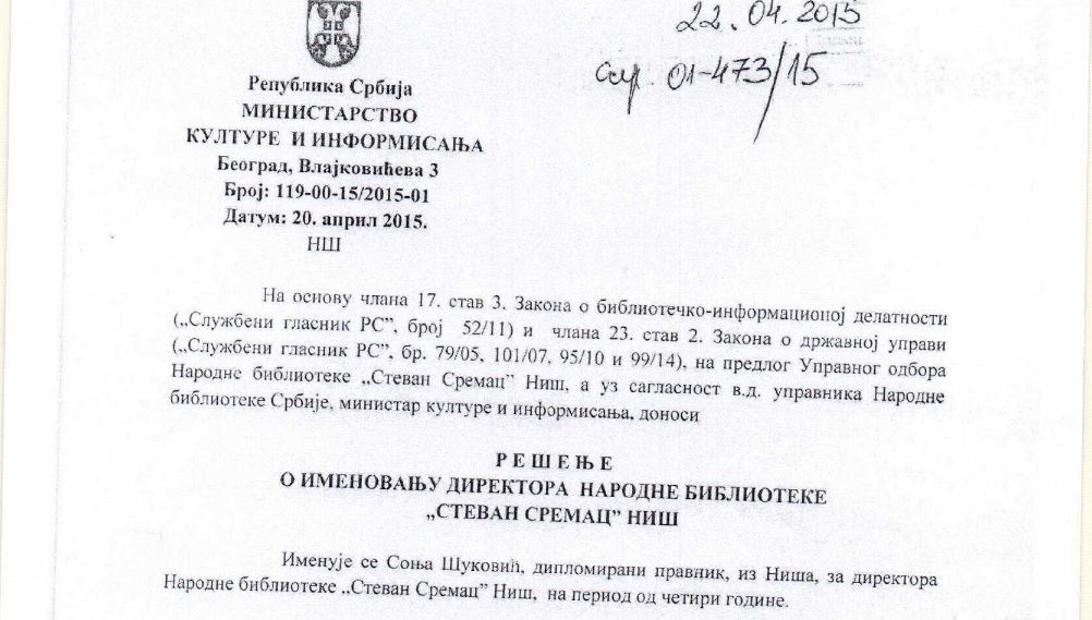 Direktorka biblioteke “Stevan Sremac” u Nišu, Sonja Šuković, po podacima koje smo tražili i dobili od same ustanove, godinama je u isteklom mandatu, dok je konkurs koji je raspisan aprila ove godine, ostao nezavršen.